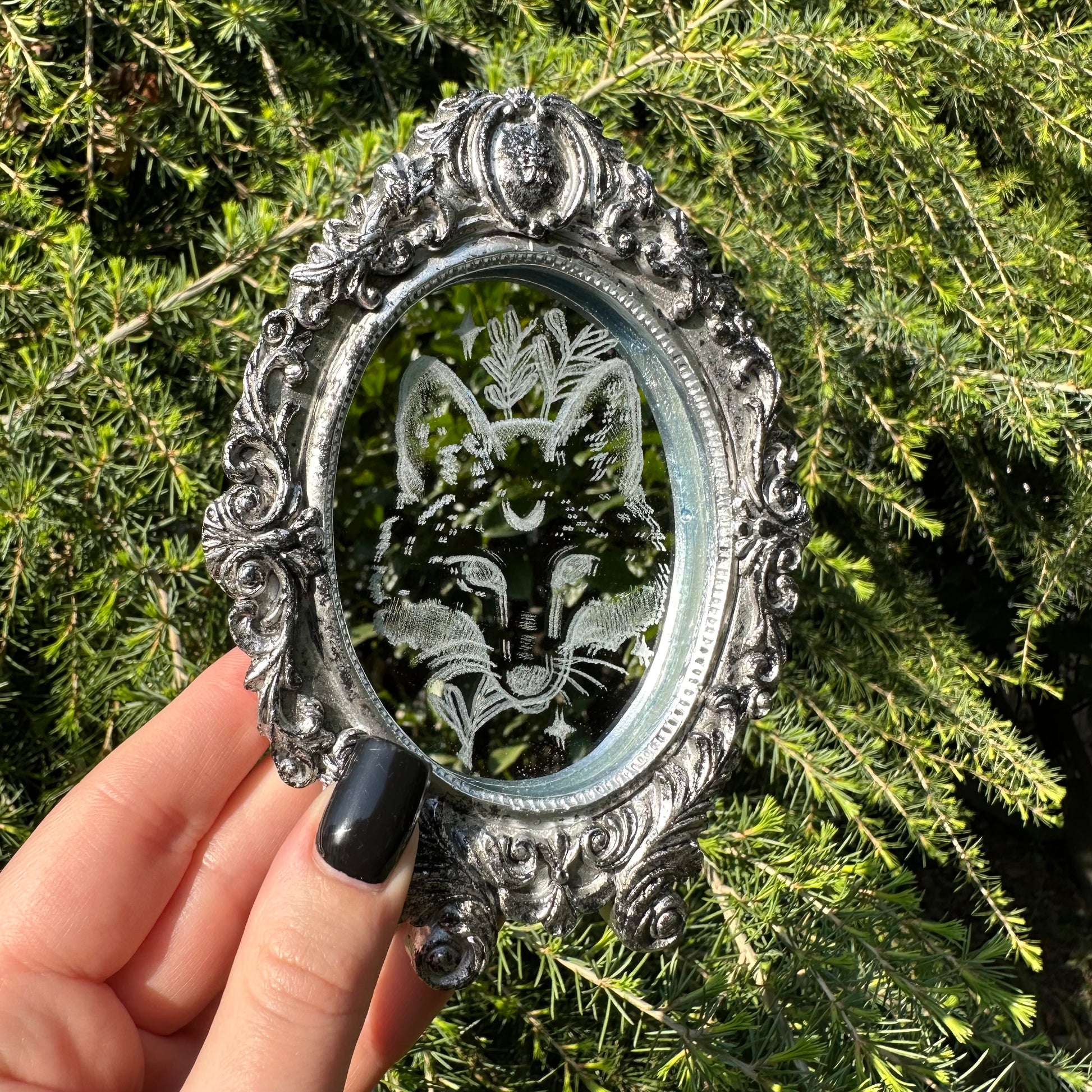 Specchio inciso a mano con supporto sul retro